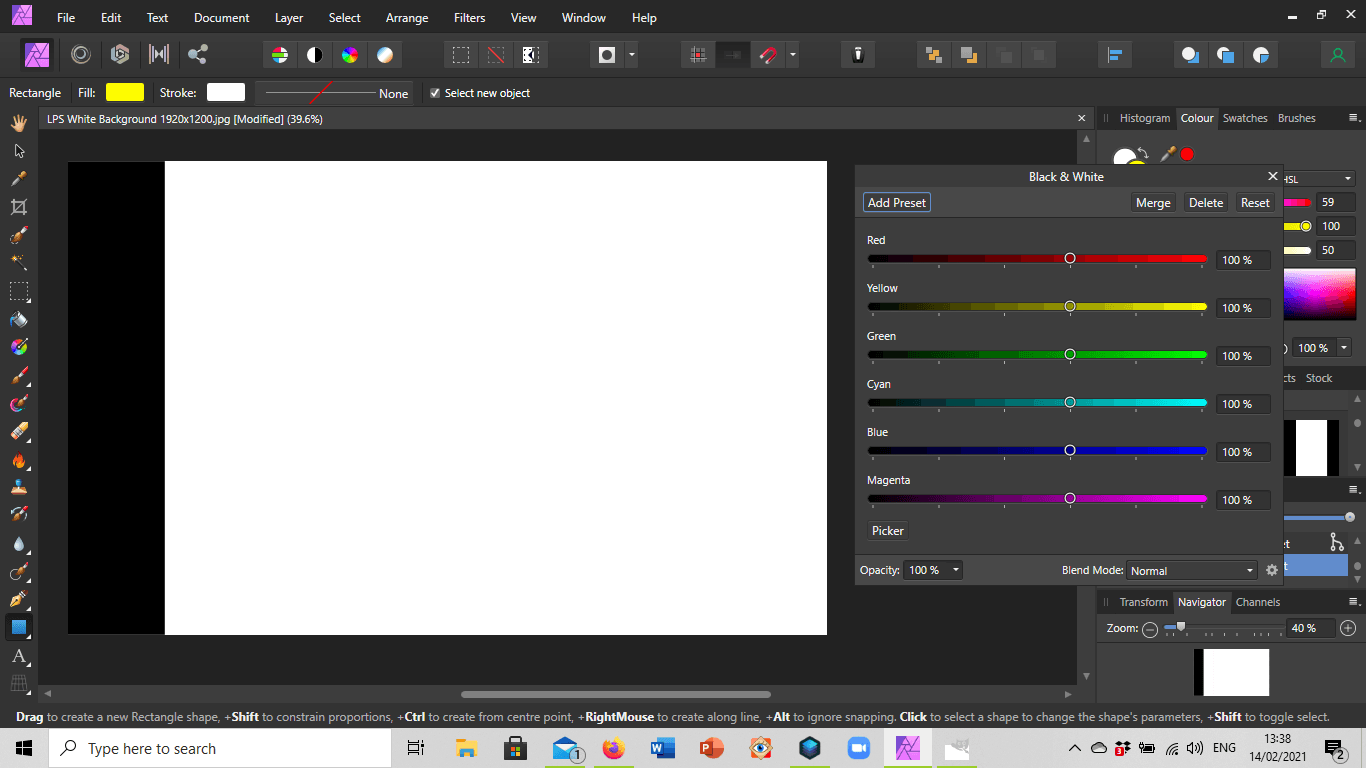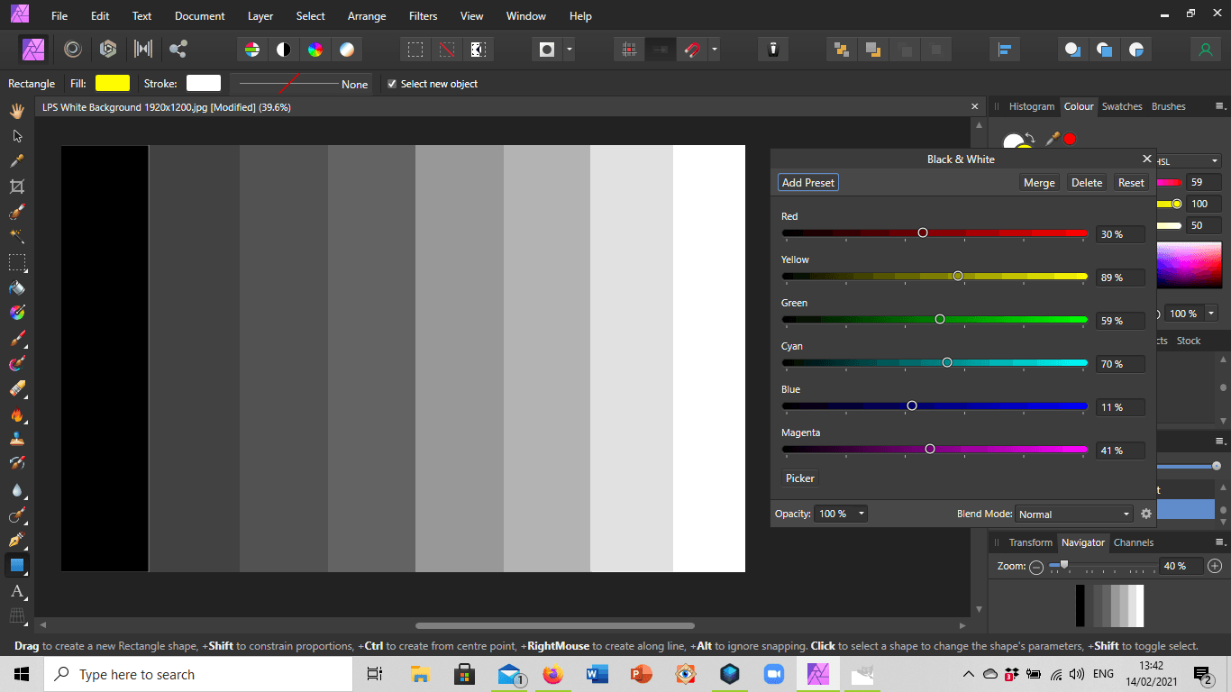 Converting this colour card to black and white in Affinity Photo does not give the expected result. The colour card displays only the black bar, with the remainder of the card showing white only, and the HSL colour channel sliders default to 50%, so, why is this?